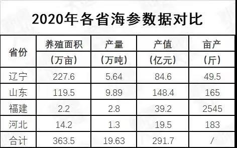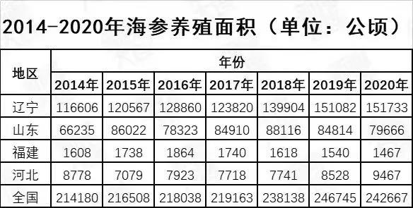 据公开报道,目前大连市海参养殖规模达193万亩(约128700公顷),其中底播养殖129万亩(约86000公顷),根据《中国渔业统计年鉴》的数据,2020年,大连底播海参养殖面积已经超过了山东省海参养殖面积的总和。