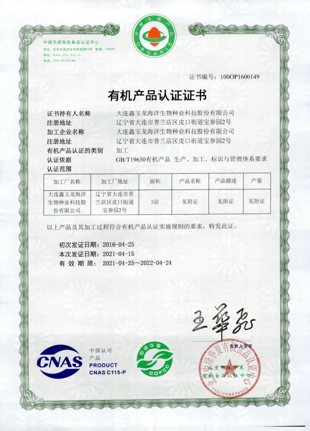 大连海参获得多项国家认证